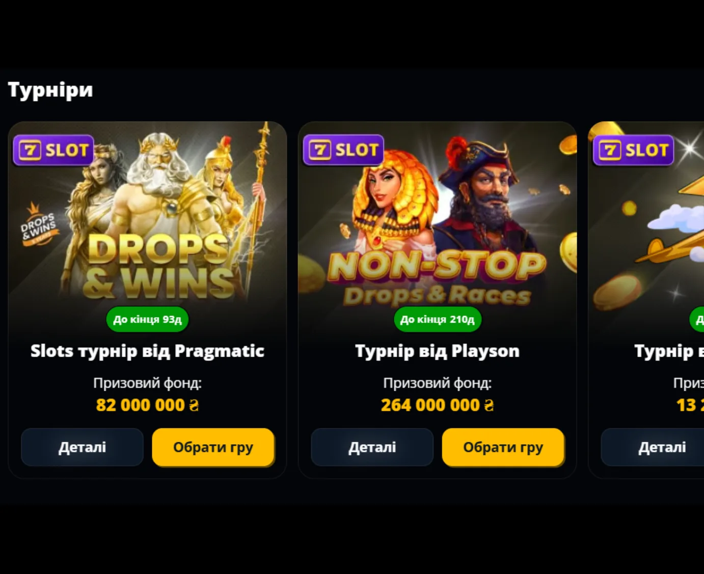 Завдяки співпраці з провідними провайдерами, такими як Pragmatic, Playson, BGaming, Spinomenal та Wazdan, кожен турнір у казино 777 відрізняється своїми унікальними правилами, тематикою та величезними винагородами.