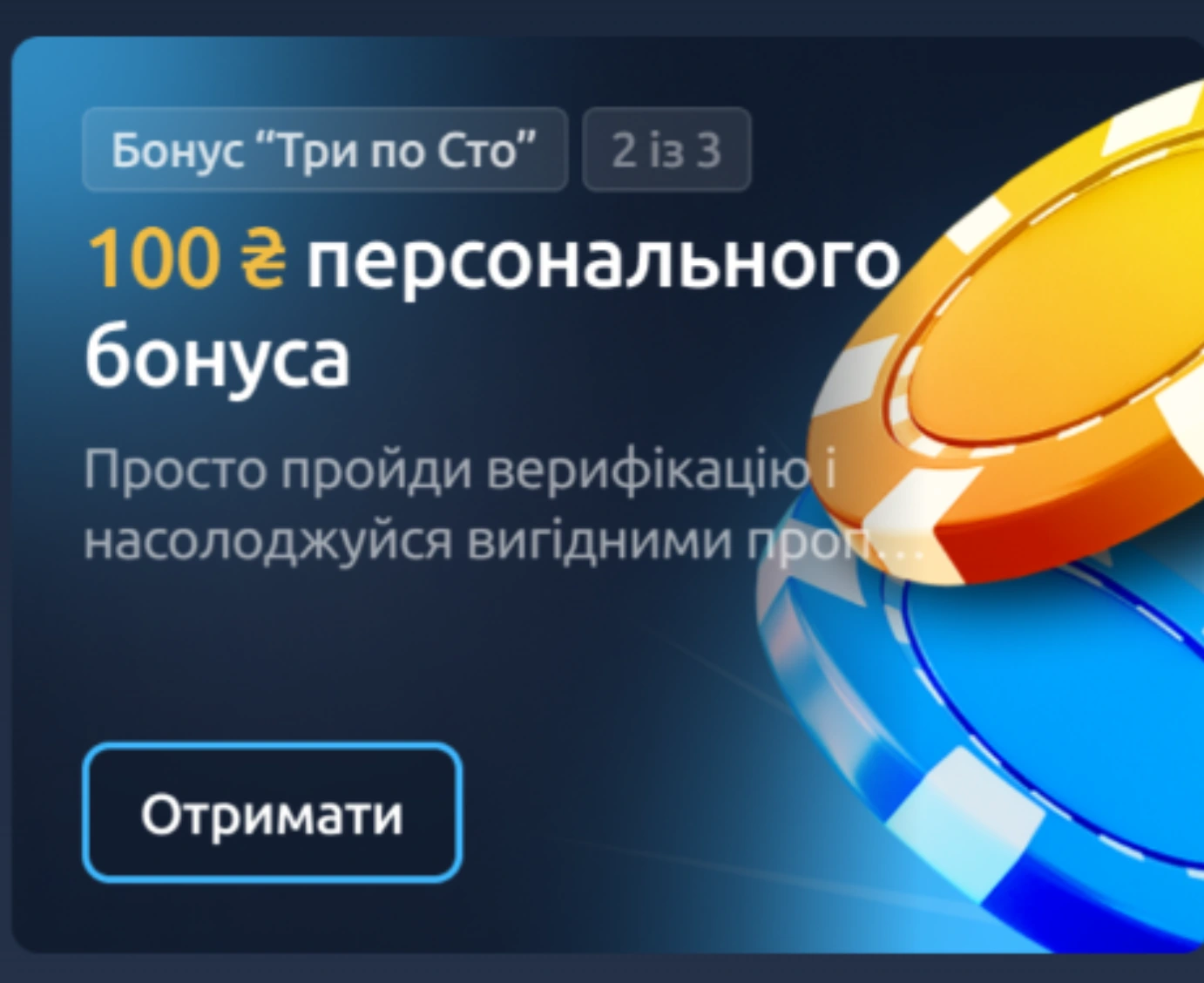 Вітальний бонус без депозиту: 100 грн персонального бонусу за верифікацію